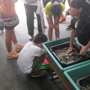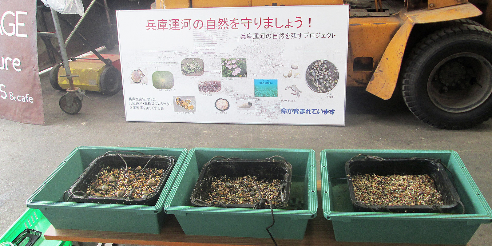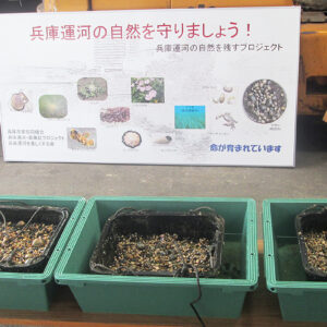 兵庫漁業協同組合様からは兵庫運河で生息しているアサリを展示していただいて、糸谷組合長や水辺ネットの安井様からアサリについての説明がありました。