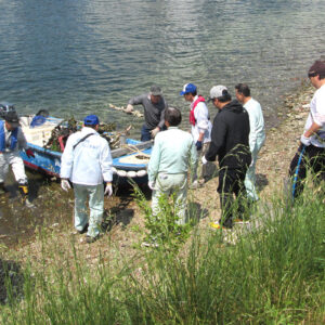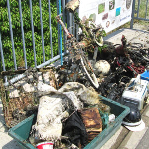 今回は、兵庫運河・真珠貝プロジェクトの道林会長様にも協力していただいてボートで運河に沈んでいる自転車等も引き揚げました。