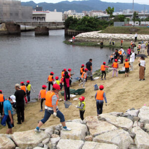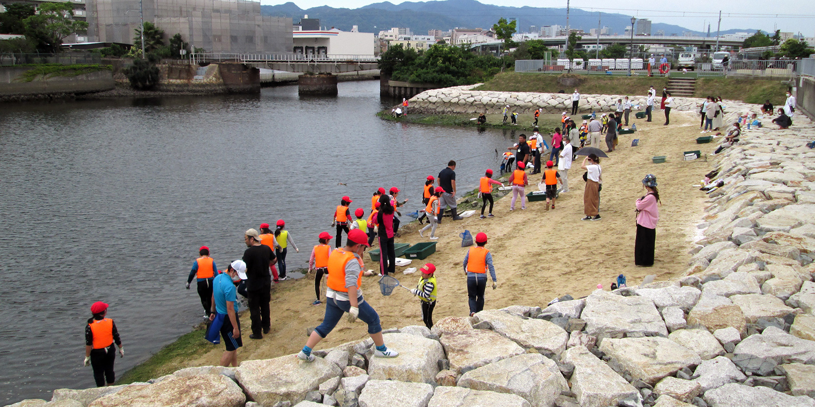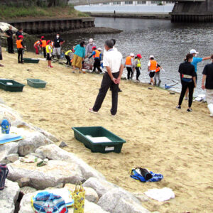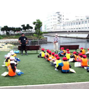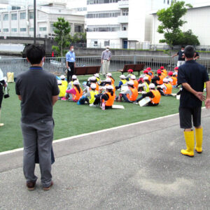 本日22日は、曇り空でしたが暑いぐらいの日和で、子供たちはライフジャケットを着用して兵庫運河に生息するアサリ等の生きものを採集しました。