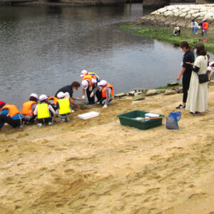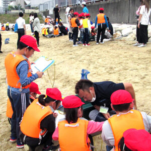 また、多くの行政関係者や保護者の見守り中、採取したアサリの計測や採取した生きものの解説を専門家に解説してもらい楽しい授業となりました。