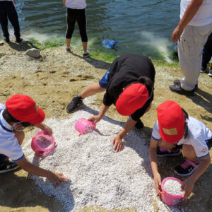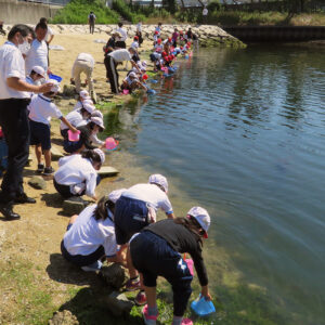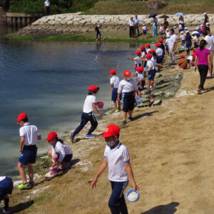 兵庫運河にヒラメの稚魚を放流!! 2020.06.23イベント行事 前日に引き続き、神戸市立浜山小学校の小学3年生の環境学習が実施されました。 最初に、神戸水辺ネットの安井講師からアサリ等の生きものについての授業を校内で約1時間行ない、その後は前日同様に、きらきらビーチ(材木橋東砂浜)での校外学習を行ないました。 きらきらビーチでは、子供たち一人一人にヒラメの稚魚の入ったバケツを渡し、兵庫運河に一斉に放流しました。 また、放流後には大阪湾フェニックスセンターから提供された水質浄化作用のある牡蠣殻の散布も行いました。 兵庫運河を美しくする会 会長 山下邦人 活動報告一覧 Share RSS イベント行事コメント: 0