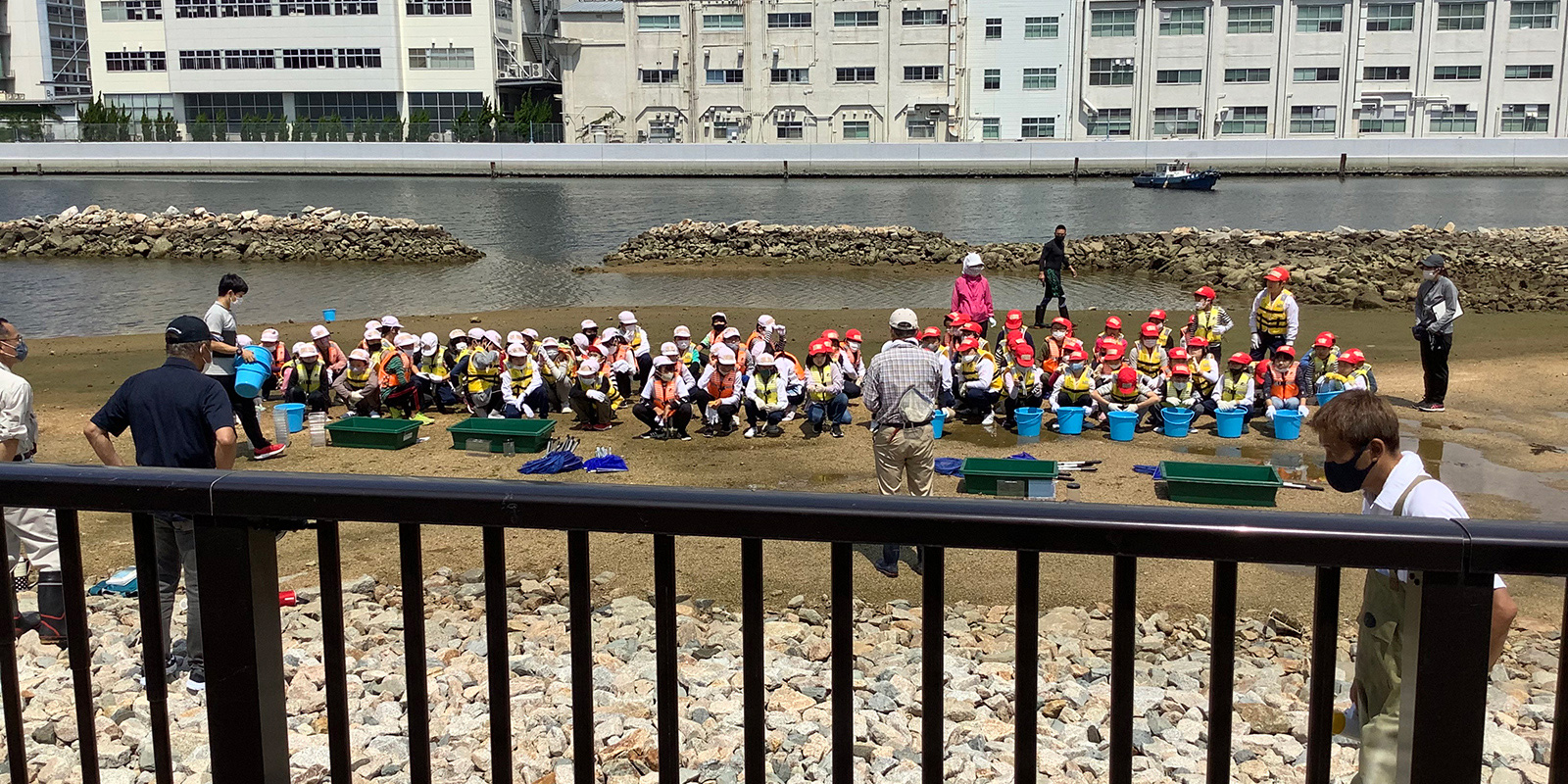 国土交通省大阪湾生物一斉調査が神戸市立浜山小学校北側の兵庫運河港湾発生材活用・干潟実証試験場で、浜山小学校4,5年生、国土交通省、みなと総研、水辺ネット、当会のメンバーである兵庫漁業協同組合の協力で行われました。