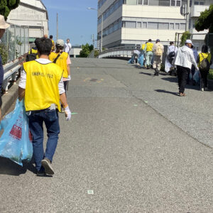 五月晴れに恵まれ、今日は盛り沢山の行事が行われました。まず9時から11時半まで、兵庫運河周辺を会員企業の従業員様、個人会員様、兵庫漁協の家族様、水辺ネットワークの皆様、行政関係の方々総勢過去最高の126名で、6班に分かれて清掃を行なっていただきました。